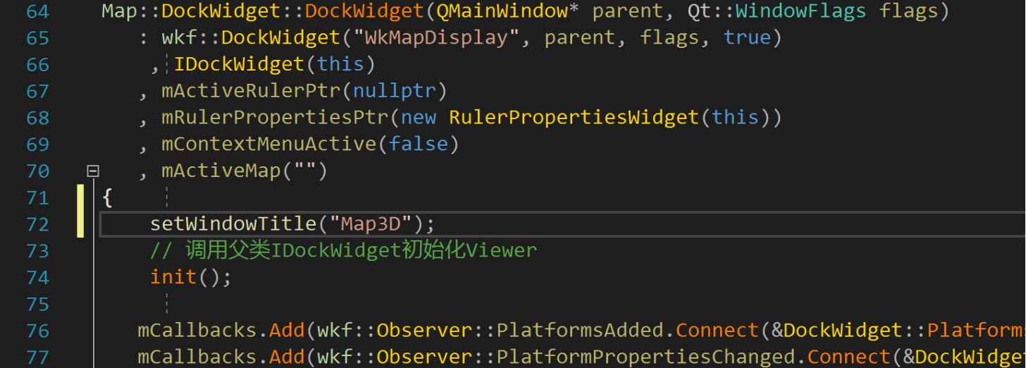 然后在MapDockWidget的构造函数中调用父类的init方法用于创建Viewer并初始化,init里的实现就是MapDockWidget构造函数的实现,所以也需要将MapDockWidget中相关代码进行删除,并且创建Viewer需要的窗口指针是通过IDockWidget的构造函数传入保存备用的:
