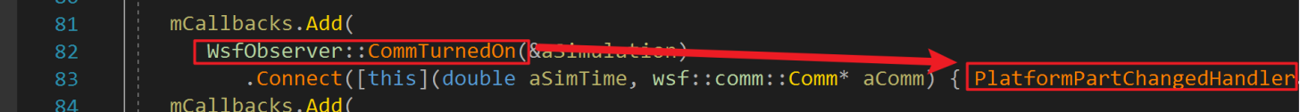 但有一种情况除外:对于某些系统内部的非仿真对象是需要知道仿真对象发生的事件,然后对事件进行处理。比如vtk框架、wkf框架捕捉Comm的TurnOn事件,然后在界面上绘制通信线。这种需求afsim是通过observer来实现的。就如上面的TurnOn处理函数来说,在实现的最后会发出一个Wsf::CommTurnedOn的observer消息: