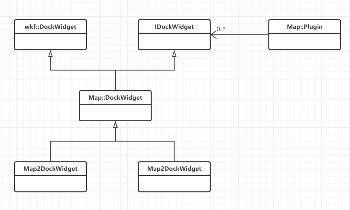 注:这里之所以设计为多继承关系,是因为不是所有DockWidget都需要继承wkf::DockWidget,也可以继承QDockWidget,因此只有多继承方式才能让Map::Plugin来按共同的接口进行统一管理。