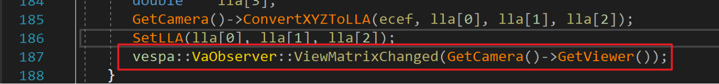 上图不多说了,主要用于实现不同视角的功能,再次回到正题:就是监听ViewMatrixChanged事件,然后获取发送事件的Viewer的位置和朝向,根据需要设置自身的CameraMontion的位置和朝向。因为vespa::VaObserver只能Connect非成员函数,所以先在MapPlugin中定义一个回调函数: