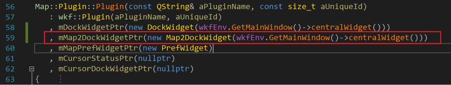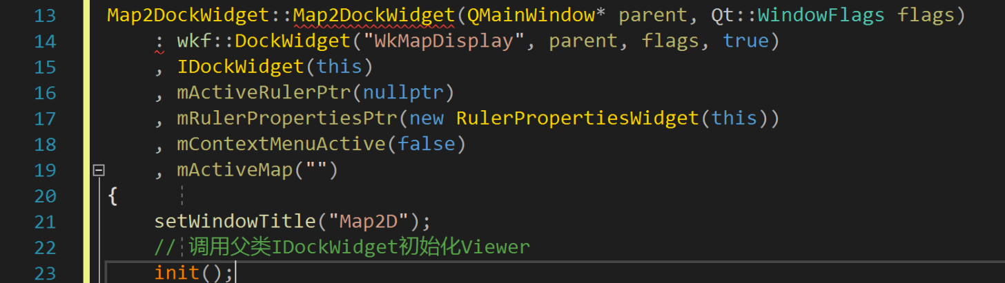 然后在MapDockWidget的构造函数中调用父类的init方法用于创建Viewer并初始化,init里的实现就是MapDockWidget构造函数的实现,所以也需要将MapDockWidget中相关代码进行删除,并且创建Viewer需要的窗口指针是通过IDockWidget的构造函数传入保存备用的: