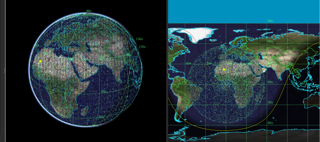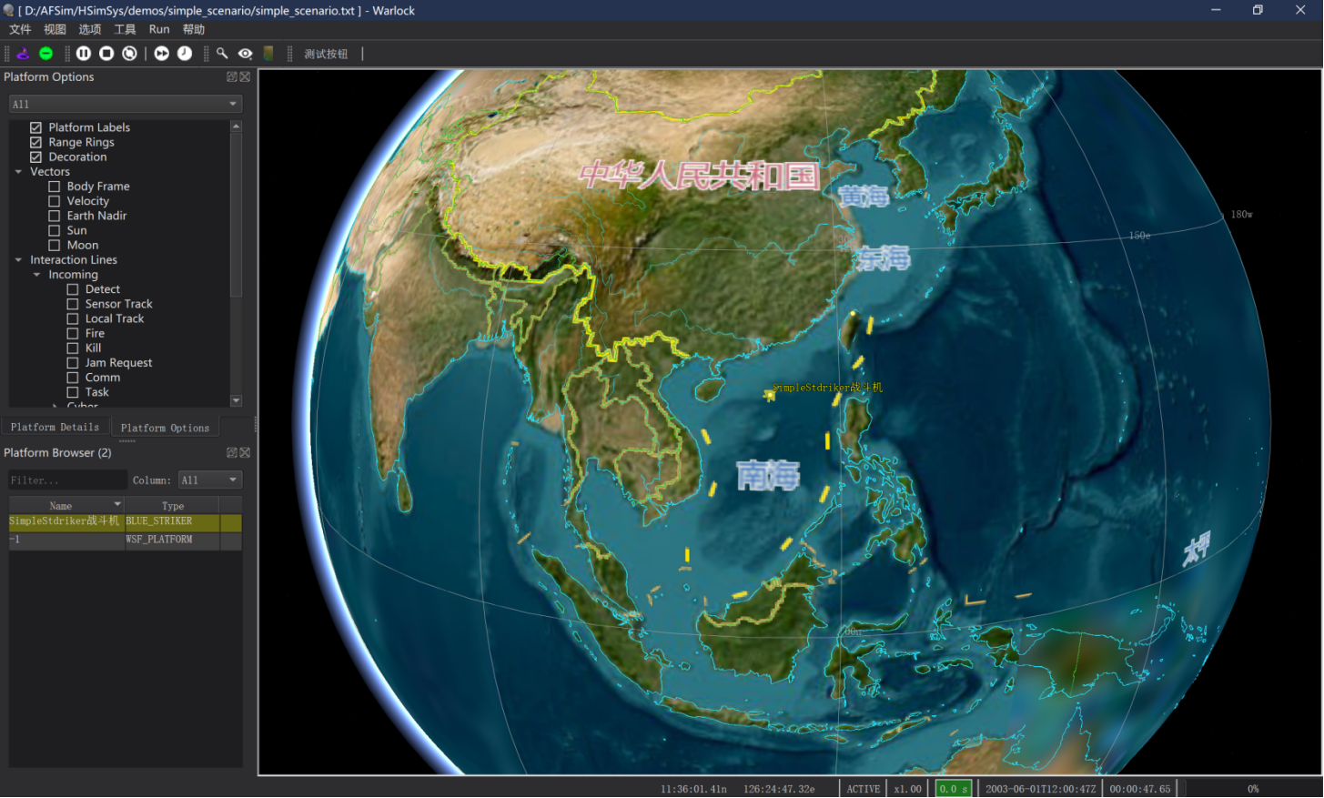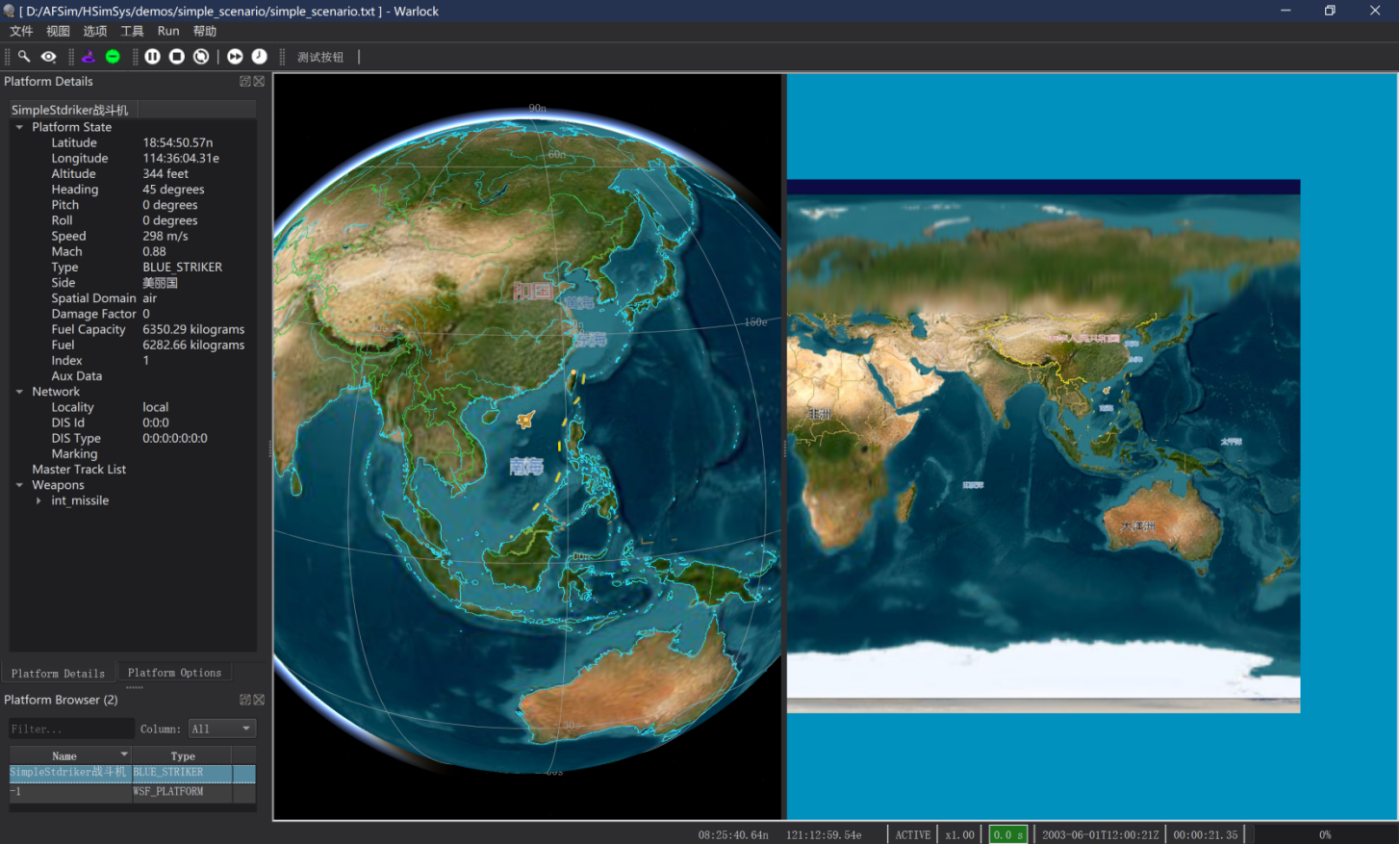 这里因为是直接复制MapDockWidget的代码,如果不做任何修改,默认加载的是三维地球,并且也是因为复制的MapDockWidgt,因此在warlock加载场景后,也会显示出平台,点击平台同样会触发选中事件,右键菜单与原本的三维操作是一样的,并且通过Preferenc修改的部分效果(如颜色)会同步在两个球上更新: