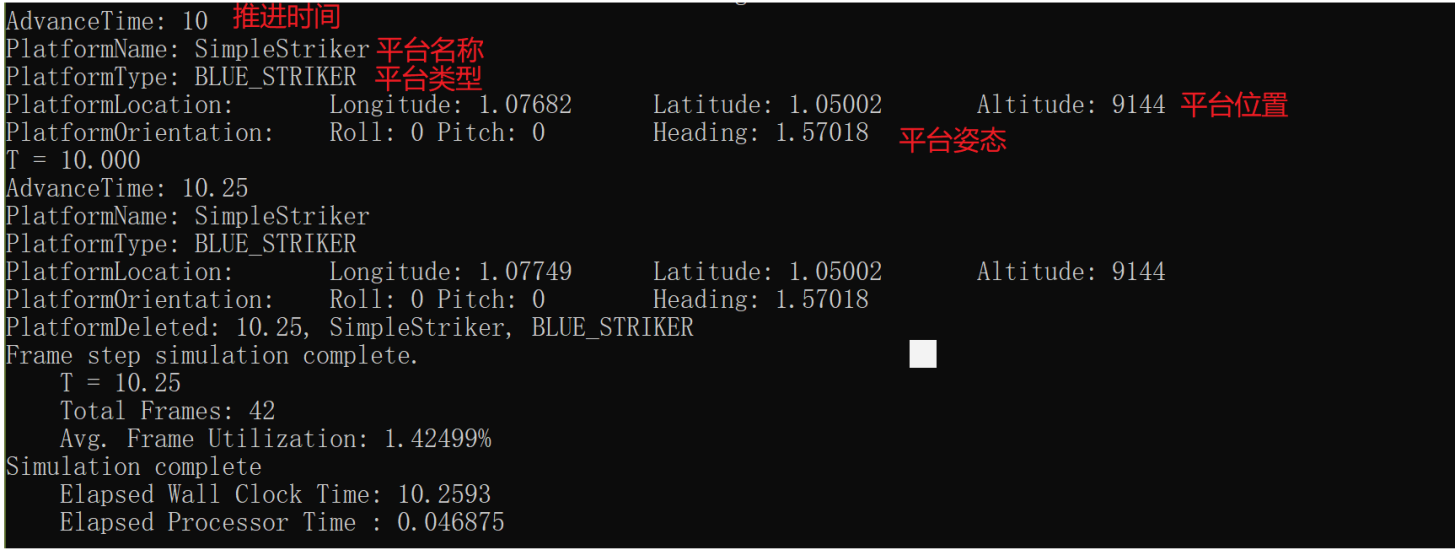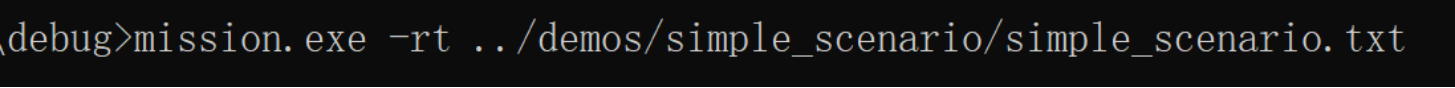 准备工作做完并成功编译出插件dll后,可通过mission.exe程序加载运行,这里通过加载AFSim自带的demos中的simple_scenario场景来测试运行。此场景中只有一个平台,名称是SimpleStriker,类型是BLUE_STRiKER。