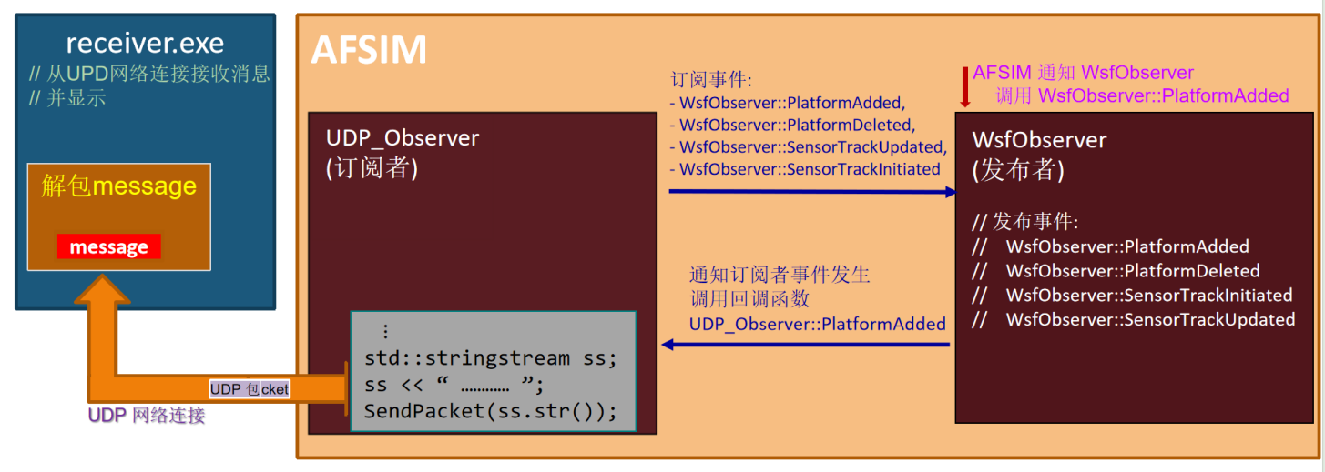 AFSim提供的Observer机制,允许AFSim的WSF框架来通知某些事件,扩展的插件可以监听这些事件并添加回调处理,这样就不必修改核心框架(即WSF源码),常用于将仿真数据进行收集和记录,并发送到外部处理程序。