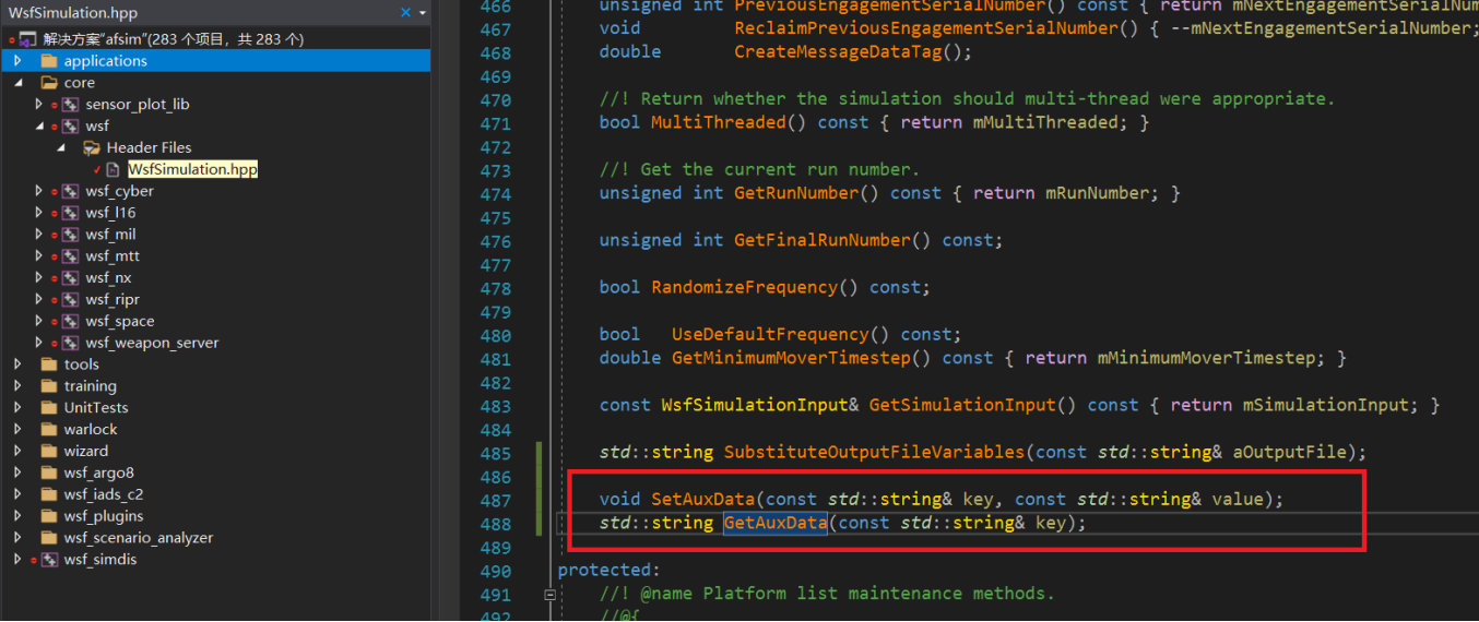 1)打开头文件WsfSimulation.hpp,在第487和695行添加以下代码:
