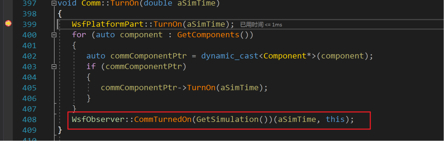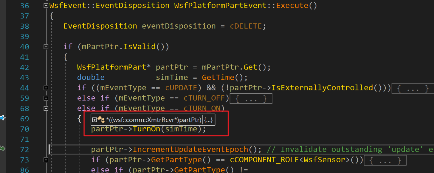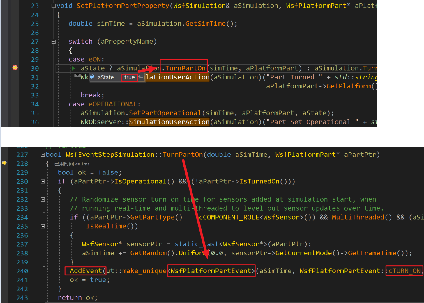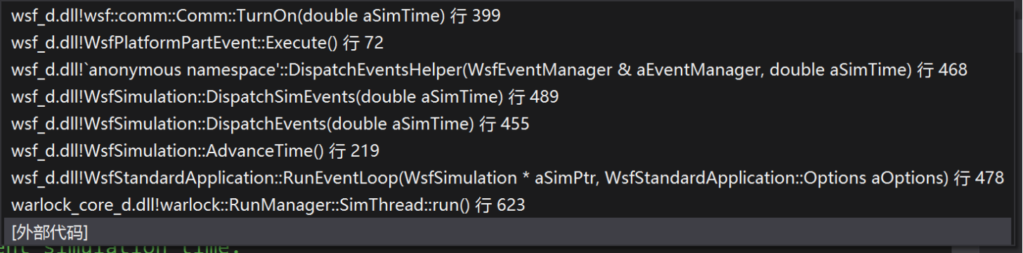 这里显示了DispatchEvents的调用,也印证了前面说的afsim的事件处理机制。从上图可知,TurnOn的调用是在WsfPlatformPartEvent的Execute中完成的: