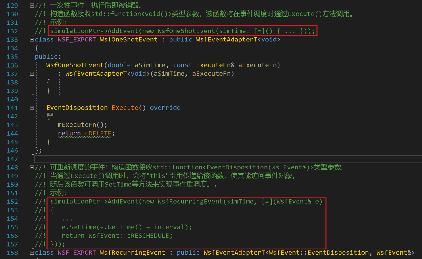 WsfEvent所有事件的基类,由WsfEventManager负责管理,但WsfEventManager并不是单例,而是与单个Simulation对象绑定的,这样设计为不同想定的仿真同步运行提供了框架上的支持。从WsfEvent头文件中可知,我们可以创建两种类型的事件:1、一次性事件;2、可重新调度的事件(内部数据不一定相同)。并且在WsfEvent中也给出了创建这两种类型事件并添加到仿真的具体示例(注:支持C++的Lambda语法的哦^_^):