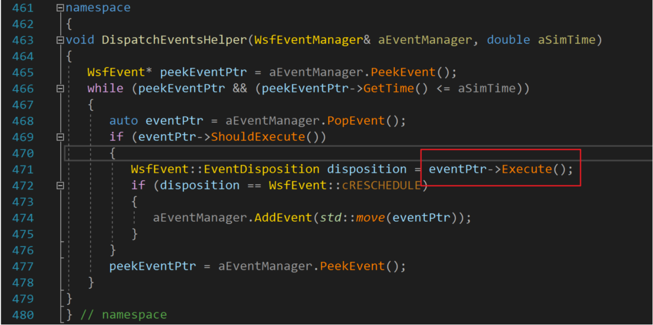 此方法的实现是通过WsfEventManager管理的所有WsfEvent,并根据仿真时间进行调度。具体的调度是在WsfSimulation.cpp中的一个封装方法,通过此方法来触发每个WsfEvent的Execute回调。